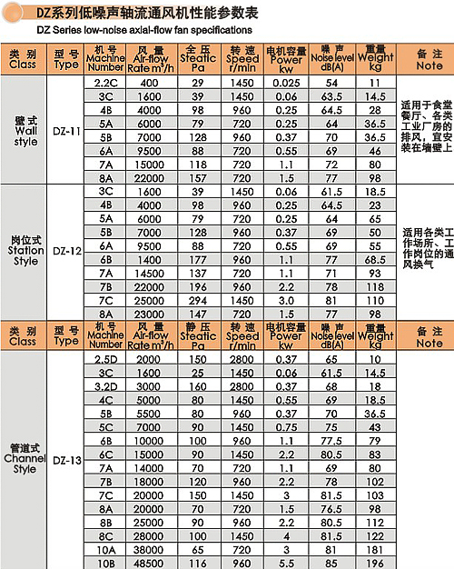 DZ系列低噪聲軸流風機采用寬葉片大弦長,空間扭曲、傾斜式葉形,從聲源學入手,利用低轉速、高壓力系數的設計方法來達到工程所需風量、風壓的要求,同時也使風機具備效率高、噪聲低、能耗省、運行平穩的特點。